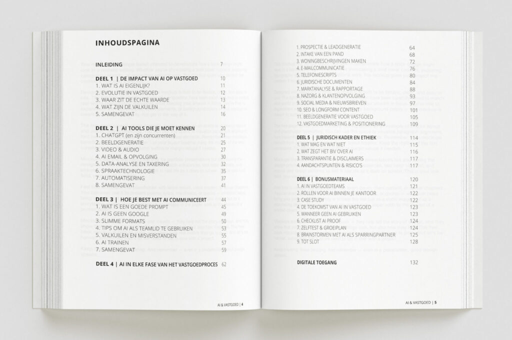 Nee. Het boek is geschreven met vastgoedmakelaars als hoofdrol, maar is evengoed interessant voor schatters, zelfstandige vastgoedexperten, marketingverantwoordelijken, projectontwikkelaars of medewerkers in vastgoedkantoren. Iedereen die met communicatie, prospectie of vastgoedcontent bezig is, haalt er waarde uit. Zelfs buiten de vastgoedsector kan dit interessant zijn om de werking van AI tools te begrijpen.